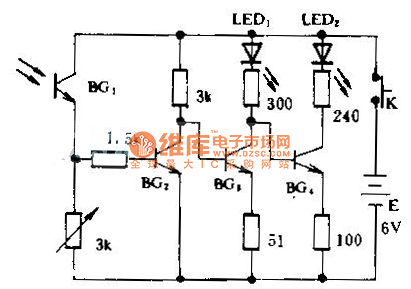 When the light is bright, BG1 outputs strong current, so that BG2 can be in the saturation, BG3 ends and BG4 connects, LED1 is off and LED2 (red) lights.