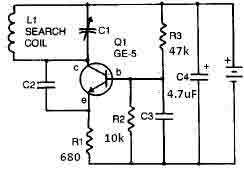 This metal detector circuit needs to be powered using a 9 volts power supply ( DC) or a 9 volts battery . The C1 capacitor is a variable capacitor with a value of 365 pF , C2 is a 100pF silver mica capacitor , C3 is a 0.05 uF disc capacitor and the C4 is a 4.7 uF capacitor . The Q1 transistor can be RCA SK3011 npn transistor or equivalent type and all resistors need to be ? watts.