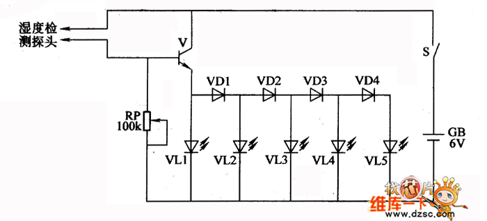 The circuit principle: this soil humidity tester circuit is composed of the humidity detection probe, the transistor V, the diodes VDl-VD4, the LEDs VLl-VL5, the potentiometer RP, the power switch S and the battery GB. When the humidity detection probe is not in the soil or the soil is too dry, the V and the VDl-VD4 are in the cut-off state, VL1~VL5 do not emit light. When the soil has certain humidity, the soil moisture makes the resistance between the two electrodes of the humidity detection probe lower and lower, V conducts, VLl-VL5 turn on one by one. The greater the soil moisture is, the stronger the V conduction capacity is, the more number of LEDs will turn on.