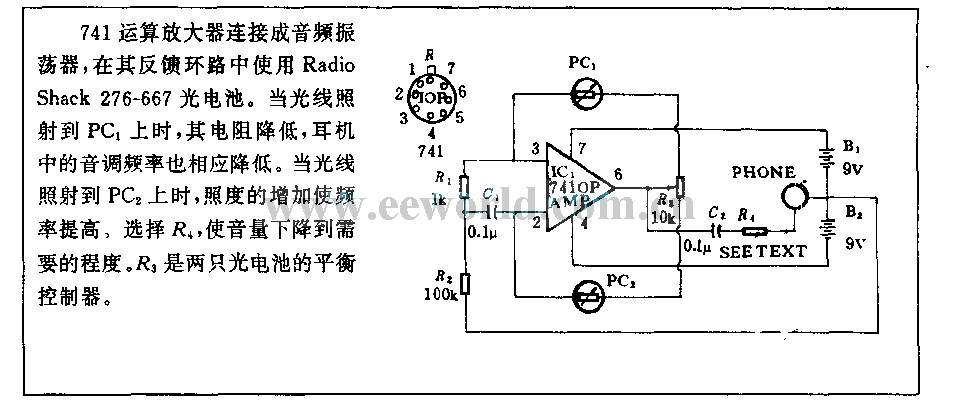 741 operation amplifier is connected to audio oscilaltor, using Radio Shack 276-667 photoelectric cell in feedback loop. When the light shine on PC1, the resistance decreases, the earphone tone frequency declines too. When the light shine on PC2, the increasing illuminance makes the frequency rise. Selecting R4 can make the volume drop to needed degree. R3 is a balance controller of two photoelectric cells.