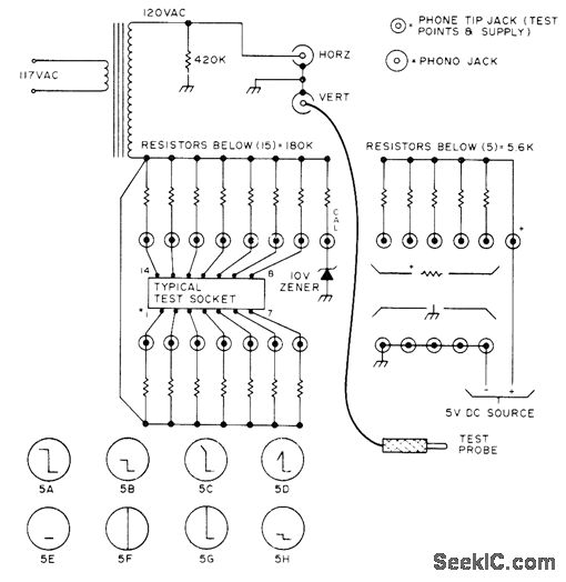 Used to check quality, identify intemal sections, and identify terminals of unmarked TTL ICs. Operates from 5-VDC source, which should have current-limhed output for fuse protection against shorts. Used with ordinary CRO, for which horizontal and vertical lacks are shown on diagram. Article tells how eight different oscilloscope displays are interpreted, and gives procedure for identifying terminals of chip one by one as test probe is held on pins.-S.S.Smith, Jr., A TTL Tester, 73 Magazine, Oct. 1976, p 110-111.