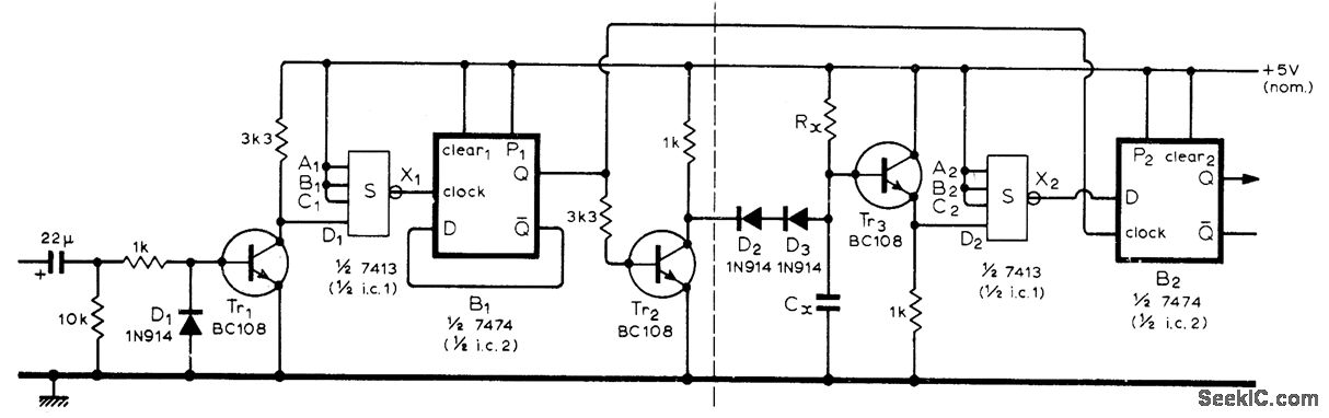 Replaces resonant reeds commonly used in multichannel radio-con-trolled models to detect modulation frequency being transmitted. Use of IC logic has advantage that range of audio frequencies can exceed an octave, whereas reeds cannot because they respond to second harmonic. Decoder has digital high-pass characteristic that is passed through inverter to give digital low-pass characteristic. Values of RX, and CX determine critical frequency; for 900 Hz, use 150,000 ohms and 0.015 μF. To obtain n nonoverlapping bandpass characteristics, n - 1 basic elements with different critical frequencies are required; components to left of dashed line may be common to all these elements. Article covers multichannel systems in detail, along with use of time-division multiplexing.-C. Attenborough, Radio Control Tone Decoder, Wireless World, Dec.1973, p 593-594.