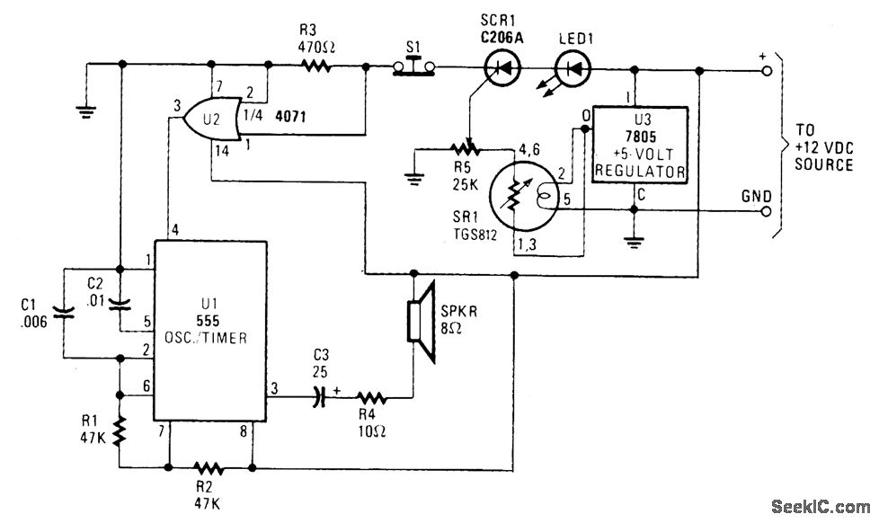 The major device in the circuit is SR1(a TGS812 toxic-gas sensor manufactured by Figaro Engineering Inc.) The gas-sensitive semiconductor (acting like a variable resistor in the resence of toxic gas) decreases in electrical resistance when gaseous toxins are absorved from the sensor surface. A 25,000 ohm potentiometer(R5) connected to thesensor serves as a load, voltage-dividing network, attd sensitivity control and has itscenter tap connected to the gate of SCR1,When toxic fumes come h contact with thesensor,decreasing its electrical resistance,current flows through the load (potentiometer R5).The voltage developed across the wiper of R5,which is connected to the gate of SCR1,triggers the SCR into conduction。With SCR1 now conducting,pin 1-volt Supplyfor the semiconductor elements of the TGS812 h1 spite of the suggested 10 volts,thusreducing the standby current.A 7805 regulator IS used to meet the 5-volt requlrementfor the heater and semiconductor elements.