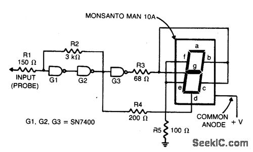 Gates GI and G2 together with resistors RI and R2 form a simple voltage monitor that has a trip point of 1.4 volts. Gate G3 is simply an inverter. The display section of the tester consists of a common anode alphanumeric LED and current-limiting resistors. It indicates whether the input voltage is above or below 1.4 V, and displays a H or a L (for high or low logic-level) respectively.