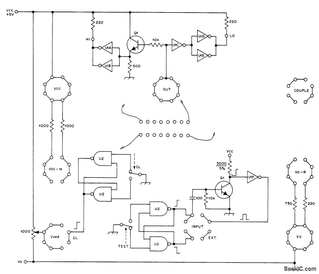 Test panel provides fast static test of surplus 7400 series TTL ICs. Each contact of 16-pin DIP socket has lead that can be plugged into array of seven othersockets carrying various supply voltages, loads, etc. Switches provide pulses of input current for toggling or clocking, counting, and resetting. Leads also serve for cross-coupling gates in IC to make flip-flop and forsetting up other simple circuits. Input voltage control allows plotting of transfer functions and study of circuit operation under different signal-level conditions. Extemal test meter can be connected when necessary. HI and LO indicators are LEDs that show level of terminal connected to output socket. Transistors are general-purpose NPN such as 2N2926. U1 is SN7404 hex inverter, and U2 is SN7400 quad two-input NAND gate. Tester is not suitable for complementary MOS devices requiring protection from static charges. Article gives detailed instructions for testing each type of TTL device.-J. S. Worthington, A Simple TTL Test Panel, QST, Dec. 1976, p 25-27.