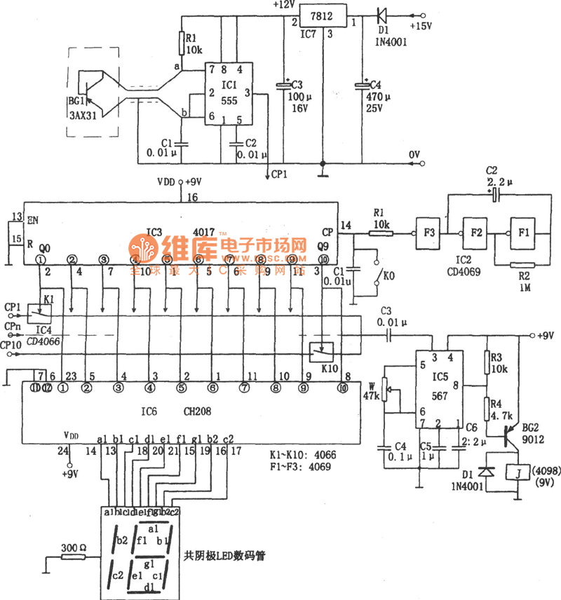 In the circuit, IC2 adopts hex inverter CD4069, and F1,F2,F3 make up trigger generator of 0.2 Hz, that is to send a count pulse CP to the count circuit IC3 every 5 seconds.