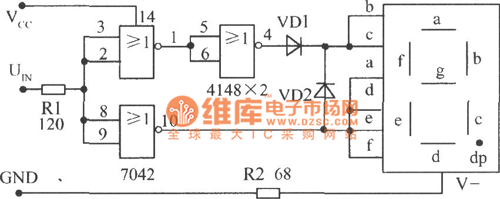 TTL NOR gate is connected as inverter, and it is equipped with common cathode LED,the high level shows q, low level displays 0. The circuit is shown in Fig.