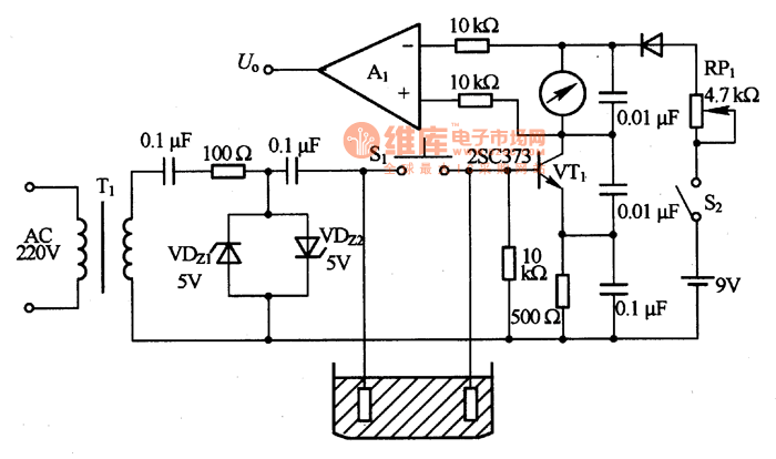 This is a liquid concentration measuring circuit. The principle of the circuit is that to insert two poles in the liquid, and get the voltage, then the concentration of the liquid is indicated by the meter. The AC voltage is reduced by the transistor of T1, and then is change into a square wave potential after passing VDZ1 and VDZ2, the stabilizers. Thus, the AC voltage is hold by the stabilizer tube, and the change of power supply wouldn't affect the measured circuit. The square wave potential is imposed on the base electrode of VT1 by the pole, and it changes with the concentration of the liquid.