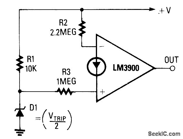 The output goes high when the supply falls below a value determined by zener diode D1. If D1 is a 5.6-V zener, the op amp will switch high when the supply voltage falls below approximately 11 V. The precise trip point can be varied by replacing R3 with an 820-kΩ resistor in series with a 470-k0 potentiometer.