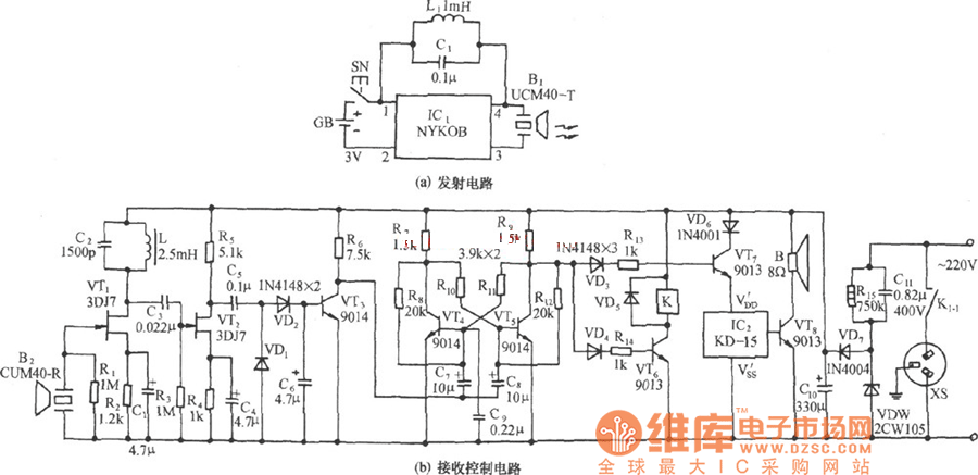 The circuit in the above picture is composed by ultrasonic remote transmitter (picture a) and receiving and controlling sections. The circuit adpts 40KHz ultrasonic signal as the remote control command, with a effecting range of no less than 25m2.