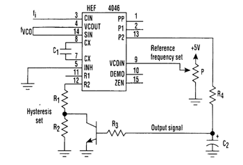 Comparison of an input signal's frequency (fi) with that of voltage-controlled oscillator (fVCO) can be accomplished with just one CMOS phase-locked loop IC and a transistor (see figure). The phase and the frequency can be compared with a phase comparator, which, along with the VCO, is part of the HEF4046 PLL IC. The transistor helps introduce hysteresis, enabling the circuit to be used as a switch driver.
