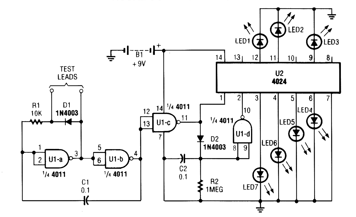 By judging the rate at which a particular LED flashes, you'll be able to estimate the resistance.The circuit consists of two IC's (1 4011 CMOS quad 2-input NAND gate, UI; and a 4024 binary counter, U2), seven LEDs, and a handful of additional components. All of the gates in UI are wired as inverters.Two of the inverters (U1-a and UI-b) comprise an astable-multivibrator (free-running oscillator) circuit, whose operating frequency depends on the amount of resistance detected between the test probes. Feedback from the output of the oscillator (at pin 4 of U1-b) back to the input of the circuit (at U1-a, pins 1 and 2) is provided via C1. Resistor, RI, along with the unknown resistance between the test probes, completes the RC timing circuit. The frequency of the oscillator decreases as the re-sistance between the test probes increases.The output ofthe oscillator is fed to pin 12 and 13 of UI-c, the output of which then divides along two paths. In the first path, UI-c's output is applied to the clock input of U2 (a 4024 binary counter) at pin 1; in the other path, the signal is fed through D2 and across capacitor C2, causing it to begin charging. The charge on C2 is applied to UI-d at pins 8 and 9. The output of that inverter (UI-d) is fed to the reset terminal (pin 2) of U2. If there is continuity or a measurable resistance between the test probes, U2's reset terminal is pulled low, triggering the counter and allowing it to process the in-put pulses (count).The rate of the count is proportional to the resistance between the test probes. If the resistance between the test probes is low, the counter advances slowly. The counter provides a 7-bit binary out-put that is wired to seven LEDs.When the test probes are placed across a short circuit, LED7 flashes. If the tester is placed across a resistance of, for example, 2 MO, LED1 will flash. In either case, the LED whose assigned value most closely corresponds to the resistance connected between the two probes will flash con-tinually 1t a steady pace, u|hile the other LEDs will seem to flash intermittently.