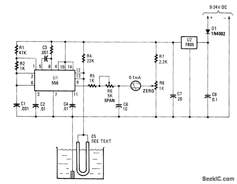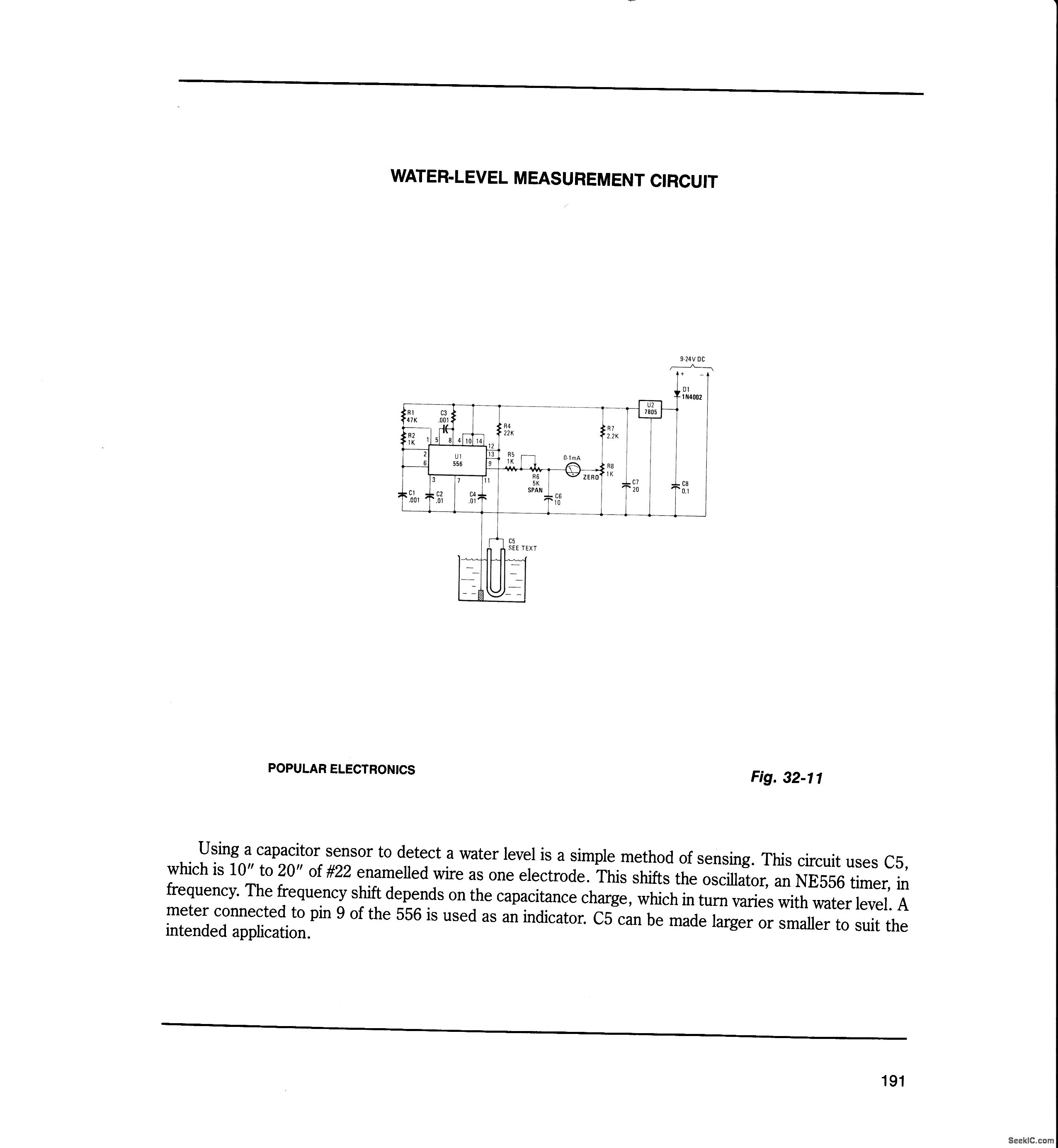 Using a capacttor sensor to detect a water level is a simple method of sensmg.This circuit uses C5,which is 10 to 20 of ﹟22 enamelled wlre as one electrode,This shifts the oscillator, an NE556 timer, infrequency..The frequency shift depends on the capacitance charge,which In turn vanes with water level.Ameter connected to pin 9 of the 556 is used as an indicator. C5 can be made larger or smaller to suit the intended application.