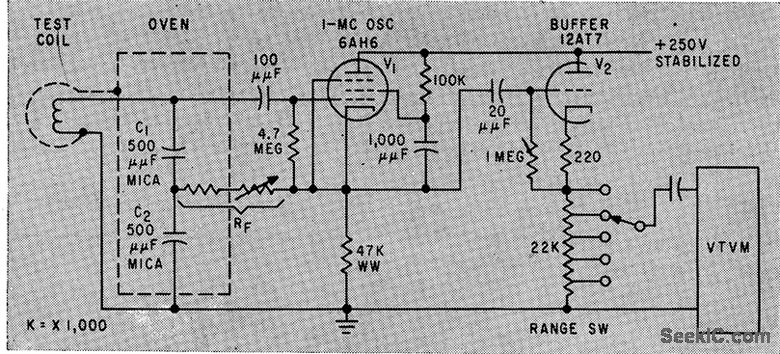 Uses principle of proximity detectors for nondestructive measurement of moving copper wire thickness during drawing operation or on coil-winding machine. Wire passing through test coilacts like shorted turn of transformer, lowering Q of coil. Stable 1-Mc oscillator and buffer drive vtvm that indicates variations in wire diameter for sizes down to AWG 46. -K. H. Jaensch, Wire Gage Provides Continuous Measurement, Electronics, 33;7, p 109-111.