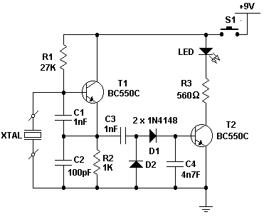This is a simple XTal tester circuit. T1 and XTal have formed an oscillator. C1 and C2 are voltage divider for oscillator. if the XTal is safe, the oscillator will work well and its output voltage will be rectified by C3, C4, D1 and D2, then T2 will run and LED will light. The circuit is suitable to test 100KHz - 30MHz Xtal.