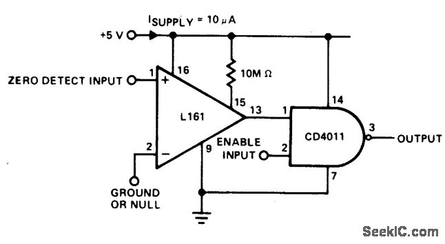 This detector is useful in sine wave squaring circuits and A/D converters. The positive input may either ve grounded or connected to a nulling voltage which cancels input offsets and enables accuracy to within microvolts of ground. The CMOS output will switch to within a few millivolts of either rail for an input voltage change of less than 200 μV.