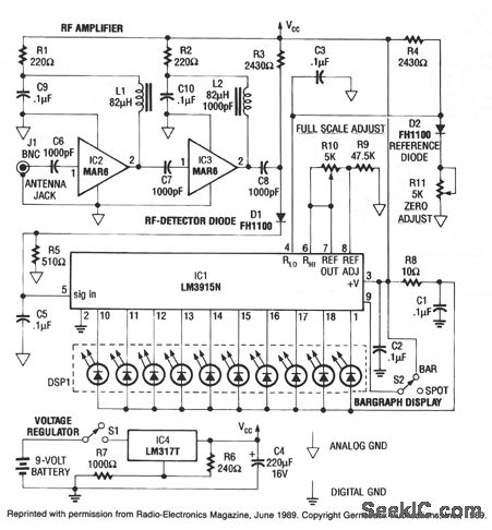 The front end has a two-stage wideband rf amplifier, and a forward-biased hot-carrier diode for a detector. After detection, the signal is filtered and fed to IC1, an LM3915N bar-graph driver having a logarithmic output. Each successive LED segment represents a 3-dB step.