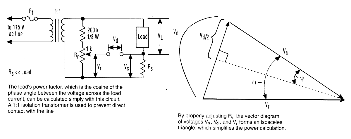 The method basically consists of determining the power factor of the load-the cosine of the phase angle between the voltage across the load and the load circuit. Using a simple circuit, that an-gle can be calculated quite simply.This circuit uses a 1:1 isolation transformer to prevent direct contact with the line. It is wise to proceed with caution whenever voltages of this magnitude are utilized in a test setup, even though the voltages that will be measured are usually below 1 V.RS is a circuit-sense resistor and Rr is a multi-turn potentiometer. The voltage across Rr is ap-proximately 0.5% of the line voltage, which should be sufficient for most applications.Rr is adjusted so that |Vr|=|Vs|; then Vd is measured. In the vector diagram according to Kirchhoff's voltage law, Vs,Vd, and Vr form a triangle, which becomes isosceles by adjusting Rr. Vs is in phase with the load current and Vr is essentially in phase with the load voltage.The power delivered to the load can be calculated as follows: