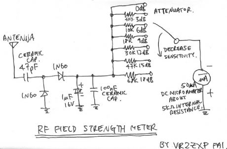 RF Field Strength Meter with Attenuator up to 200 MHz The RF field meter unit is a great help to tune transmitters for best performance and output power. You can measure the radiated energy field and can easy tune the system for max output field strength maximum power. This field strength meter comes with selectable attenuator. You can use it for measuring the antenna gain and pattern, compare different magnetic field strengths. See the following RF field strength meter schematic. (View)
