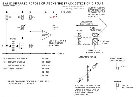 This page presents information on infrared - Above The Track and Across The Track train position detection circuits. The circuits are designed around the LM339 quad comparator chip and can use a wide assortment of matched infrared - emitter / detector pairs. The circuit bellow is the basic voltage comparator based detector circuit using the LM339 Quad or LM393 Dual comparator ICs. The LED will turn on when the infrared beam is broken. The value of the resistor R1 determines the sensitivity of the phototransistor Q1. In most cases a value of 1 Meg or 470K ohm with good results but every situation is different and some experimentation might be needed. Circuit Operation - When a train breaks the infrared beam the phototransistor will conduct less current. The voltage at the MINUS input of the comparator will rise above the reference voltage at the PLUS as determined by R3 and R4. The output of the comparator to turn ON and the LED will be lit.   (View)