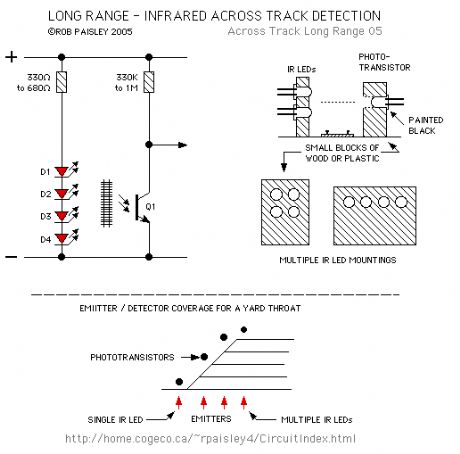 The method shown below has been tested with sensor gaps as wide as 12 inches but a distance of 8 inches or less is more practical. There is also a method that can be used for longer range across track detection that could be used for yard throats. A detector circuit of this type is in use at the London Model Railroad Group's club layout and spans seven O Scale tracks using one infrared LED and a lensed phototransistor.   (View)