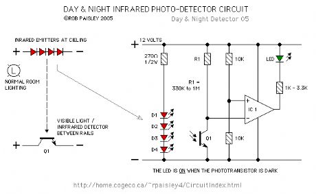 The detector for this circuit uses a voltage comparator the same as those on the Visible and Infrared Light Detectors page at this site. The major change is the mounting of infrared emitters mounted at ceiling height above the detectors phototransistor.   (View)