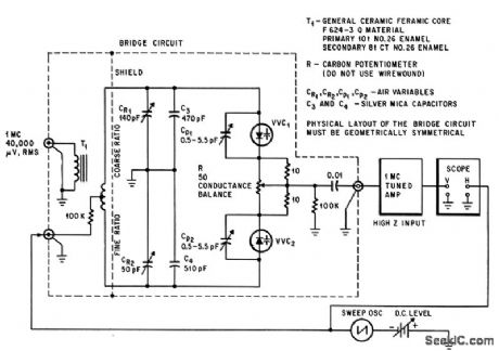 Output signal voltage of capacitance bridge, proportional to capacitance unbalance, is applied to vertical input of scope through 1-Mc preamp. Horizontal sweep voltage of scope is also applied as bias to voltage-variable capacitances VVC whose tracking is being measured, so scope display shows diode capacitance-tracking as function of bias voltage.-L. A. Weldon and R. L. Kopski, Boost for Electronic Tuning, Electronics, 37:14,p 61-63. (View)