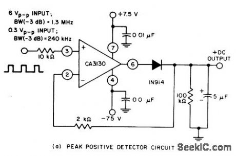 Circuits are easily implemented using the CA3130 BiMOS op amp. For large-signal inputs the bandwidth of the peak-negative circuit is less than that of the peak-positive circuit. The second stage of the CA3130 limits bandwidth in this case. (View)