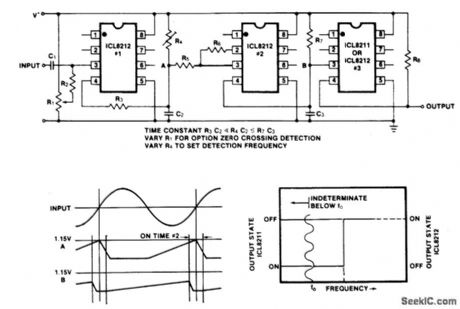 Simple frequency limit detectors providing a GO/NO-GO output for use with varying amplitude input signals may be conveniently implemented with the ICL8211/8212. In the application shown, the first ICL8212 is used as a zero-crossing detector. The output circuit consisting of R3, R4 and C2 results in a slow output positive ramp. The negative range is much faster than the positive range. R5 and Rg provide hysteresis so that under all circumstances the second ICL8212 is turned on for sufficient time to discharge C3.The time constant of R7C3 is much greater than R4C2. Depending upon the desired output polarities for low and high input frequencies, either an ICL8211 or an ICL8212 may be used as the output driver.The circuit is sensitive to supply voltage variations and should be used with a stabilized power supply. At very low frequencies the output will switch at the input frequency. (View)