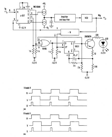 This PLL lock indicator not only can detect a 'locked or off-of-lock condition, but also even if a single pulse or transition has been missed.When being sampled by the flip-flop, if the V signal leads the input reference signal R and the rising edge of /i is lost, the D signal will remain hign throughout the interval, allowing the flip-flop to be clocked high (Fig. 26-2A). If the R signal leads the V signal when the transition is missed, the rising edge of the Tsignal will trigger the D signal of the phase detector, causing the LED to blink (Fig. 26-2B).A lock detector often is used with a phase-locked loop (PLL) or synthesizer to indicate when the loop is phase-locked with an input signal. This circuit can be helpful, but single cycle skips usu-ally frill go undetected because of the presence of the low-pass filter. (View)
