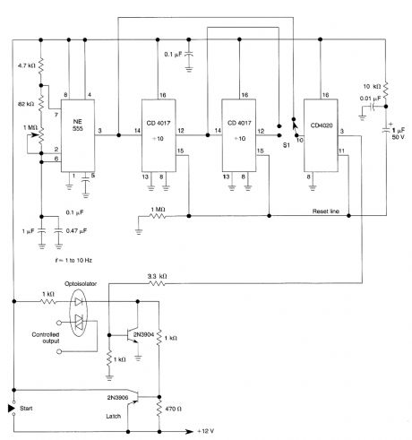 This ultra wide range timer uses a 555 timer base, two 4017Bs and a 4020B that act as frequency dividers that can be switched in and out. S1 is a SP3T range switch. (View)