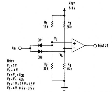 Simply by adding two steering diodes, a window detector can be built using only a single com-parator. The detector performs well for windows of about 1 V or greater, but it isn't suitable where extreme precision is required because the forward drops of the diodes vary.In the basic circuit, two resistive dividers set threshold voltage levels at both the inverting and noninverting inputs of the comparator by dividing the reference voltage. The input voltage is steered to the appropriate comparator input by diodes CR1 and CR2.When the input voltage is within the window, neither diode conducts, and the comparator is bi-ased for a high output. When the input goes above the window, CR2 conducts and pulls the inverting input high, causing the comparator output to go low. When the input voltage goes below the window, CR1 conducts, pulling the noninverting input low, again causing the comparator output to go low. The source resistance of Vinmust be low compared to the equivalent parallel resistance of each divider. (View)