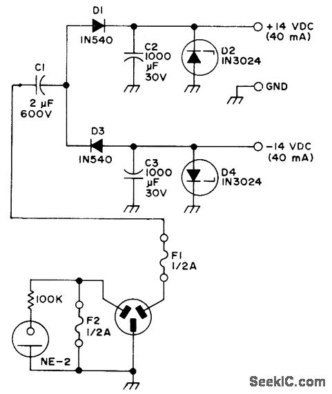 Simple low-current regulated supply requires no power transformer. Output current can be increased by using better filtering. Second ground prong is connected through fuse to grounded center conductor of AC line to guard against faulty AC wiring. If wiring is reversed, fuse will disable power supply and neon fault indicator will come on.-D. Kochen, Transformerless Power Supplies, 73 Magazine, Sept. 1971, p 14-17.