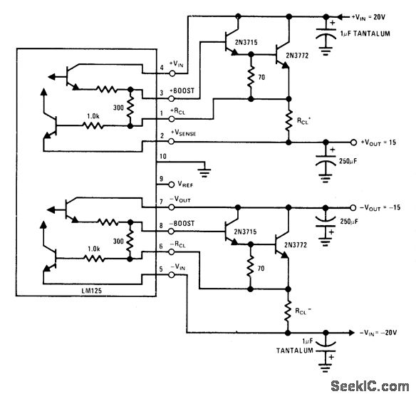 External Darlington stages boost output currents of LM125 dual tracking regulator and increase minimum input/output voltage differential to 4.5 V. Maximum output current is limited by power dissipation of 2N3772. Typical load regulation is 40 mV from no load to full load.-T. Smathers and N Sevastopoulos, LM125/LM126/LM127 Precision Dual Tracking Regulators, National Semiconductor, Santa Clara, CA, 1974, AN-82, p 6.