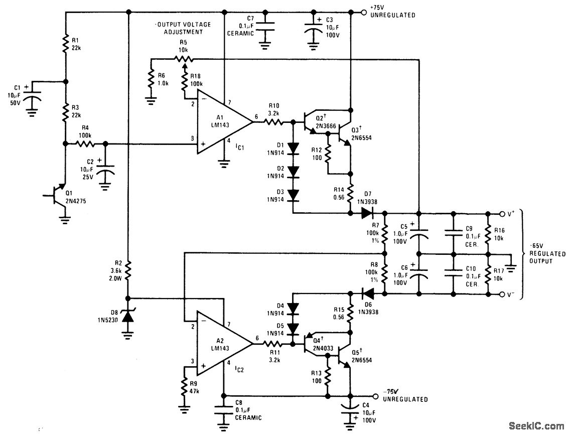 Circuit uses two LM143 high-voltage opamps in combination with zener reference and discrete power-transistor pass elements.Q1 is transistor used as stable 6.5-V zener voltage reference. Opamp A1 amplifies reference voltage from 1 to about 10 times for application through R10 to Darlington-connected transistors Q2 and Q3. Feedback resistor R5 is made variable so positive output voltage can be varied from 6.5 V to about 65 V. This output is applied to unity-gain inverting power opamp A2 to generate negative output voltage. Q2-Q5 should be on common Ther-malloy 6006B or equivalent fleatsink. Supply includes short-circuit protection. Maximum shorted load current is about 1.25 A.- Linear Applications, Vol. 2, National Semiconductor, Santa Clara, CA, 1976, AN-127, p 8-9.