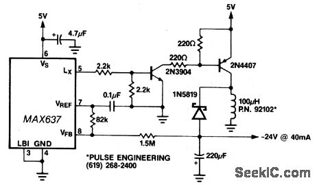 This circuit is similar to that of Fig,4-60 In that the 2N4407 is a buffered replica of the MAX637 LX output.However,the 2N4407 has a high breakdown voltage and can be used to generate a-24-V output.The -24-V output does not appear directly on any pin of the MAX637 because it is sensed via the 1.5-MΩ external feedback resistor .
