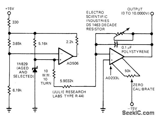 Constant cur-rent from AD506 opamp drives zener, with 5.16K resistor providing optimum current through zener for temperature-drift cancellation. Chopper-stabilized opamp scales output of zener over full range, Offset-voltage pot serves for zero calibration. Reference voltage is stable to about 11 PPM per year.4. Williams, Don't Bypass the Voltage Reference That Best Suits Your Needs, EDN Magazine, 0ct. 5, 1977, p 53-57.