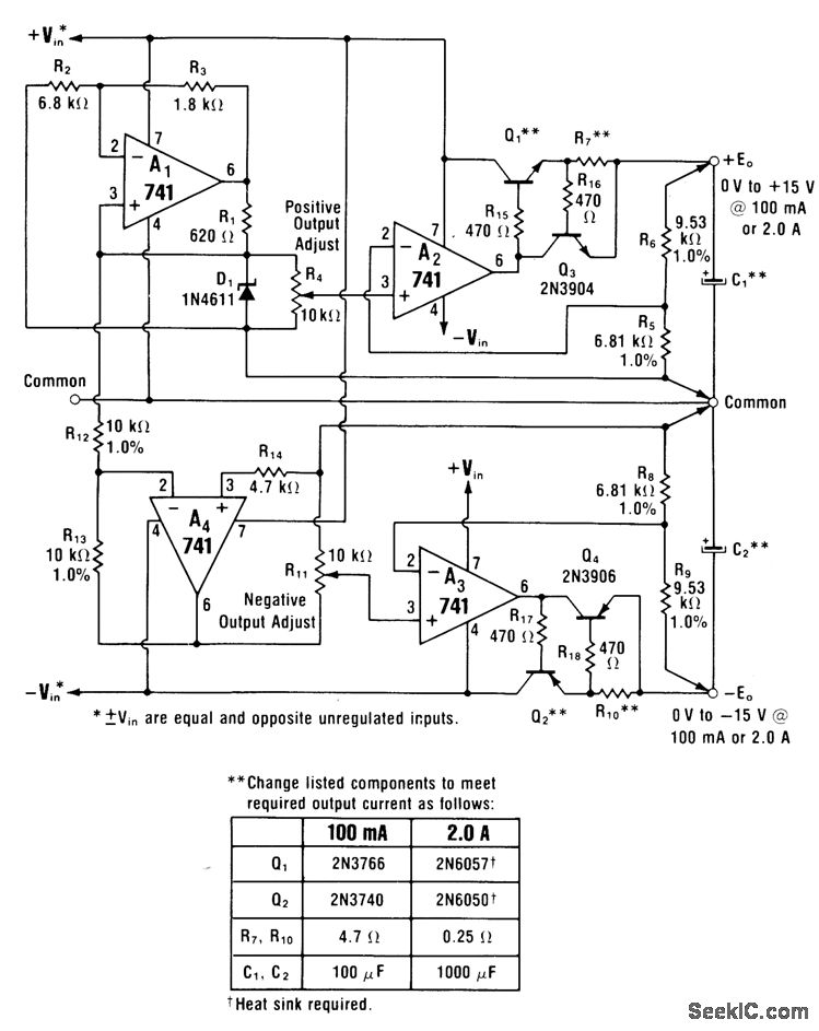 Common zener reference selrves for both regulators. Buffer A3 uses negative reference voltage developed from 6.6-V positive voltage across D1 by inverter A4. Both regulators provide 100mA or 2 A depending on transistors used.-W. G.Jung, IC Op-Amp Cookbook, Howard W. Sams, Indianapolis, IN, 1974, p t62-164.