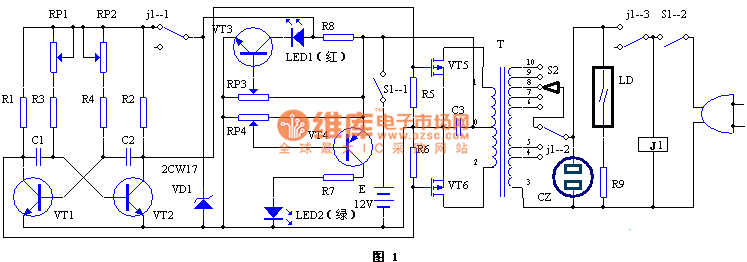 The circuit working principle is shown in diagram 1. Multivibrator consists of VT1 and VT2. Its oscillator frequency is 5Hz. When voltage decreases, in order to get the same frequency, the power supply of oscillator is regulated by voltage regulator tube VD1. The square-wave voltage isoutput by multivibrator, then it directly pushes VMOS high power pipe. The 220V AC isset up by transformer and extract from socket CZ.