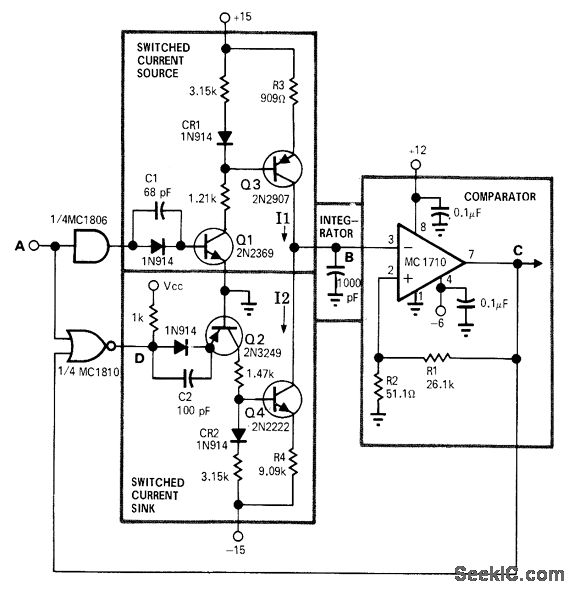 Provides negative output pulse width equal to positive input pulse multiplied by 1 + R4/R3, which is 11 for values shown. Output pulses are TTL-or DTL-compatible. Minimum output pulse width is 70 ns, and maximum is 1/11 of pulse repetition rate. Circuit consists of switched current source, switched current sink, integrating capacitor, and comparator. Q1 and Q2 act as switches for current sources Q3 and Q4, while C1 and C2 reduce turn-on and turnoff times of switches. CR1 and CR2 provide temperature compensation for Q3 and Q4. AND gate compensates for propagation delay in NOR gate, to ensure that current sink is switched on by trailing edge of input pulse. Add inverter if output must be same polarity as input.-F. Tarico, Linear Circuit Multiplies Pulse Width, EDN|EEE Magazine, Dec. 1, 1971, p 45-46.