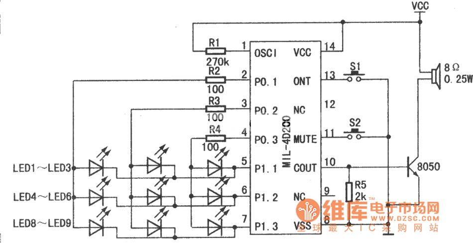 The circuit adopts the LM - 4 d200 af must not be embedded microprocessor voice, music memory ROM, dedicated COMS integrated circuit, its working voltage from 5 v to 2.4 v, the static current is less than 5 mu A. LM - type 4 d200 af must not be circuit has 14 feet DIP encapsulation, COB and three DIX chip packaging form for users to choose.