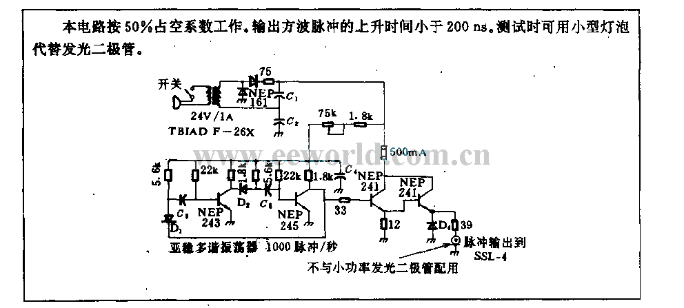 This circuit works with 50% duty cycle. The rise time of output square-wave pulse is lower than 200ns. It can use miniature lamp instead of LED to test.