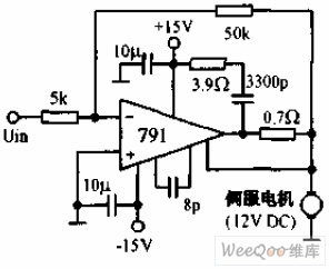 The 12V DC electrical motor driving current circuit uses the 791 power operational amplifier which is in the phase-reversing connection state, the voltage gain is 10, and it can be used to drive the positive and negative rotation No.8 12V DC servo motor. The power integrated op-amp needs to add the radiator.