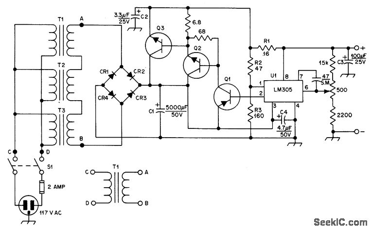 Power supply is more than adequate for handling 12-V FM transceiver and even small amplifier. Series combination of three 6.3-V 10-A filament transformers drives 12-A 50-PIV bridge rectifier supplying 18 VDC to National LM305 regulator and pass transistors. Output voltage is at least 4 V less. Circuit provides foldback-current limiting for protection against load shorts. 500-ohm pot varies output from 11.2 to 14.1 V. Q1 is 2N2905, Q2 is 2N3445, and Q3 is 2N3772. T1-T3 are 6.3 V at 10 A (Essex Stancor P-6464 or equivalent ).-C. Car-roll, That's a Big 12 Volts, QST, Aug. 1976, p 26-27.