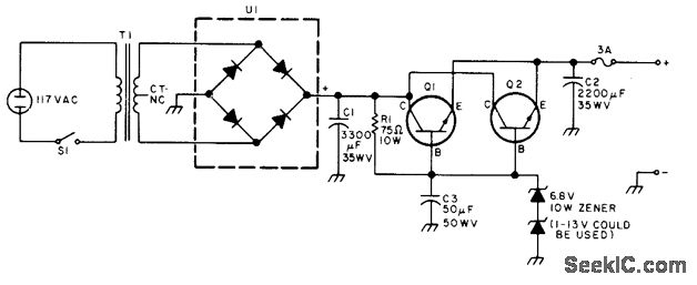 Simple supply was developed for use with 2-meter FM transceiver when operating in home Power transistors are Radio Shack 276-592 rated 40 W. T1 is 12.6 V at 3 A, and U1 is 276-1171 rated 100 V at 6 A. Article covers construction.-M. L. Lovell, 12 Inexpensive Volts for Υour Base Station, 73 Magazine, Sept. 1976, p 60-62.