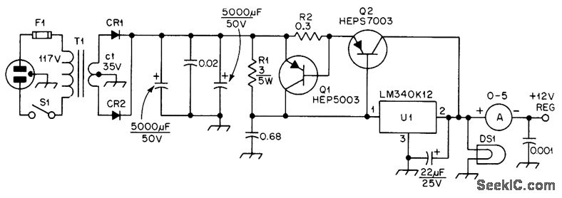 Uses National LM340K-12 mounted on external heatsink, with series-pass transistor Q2 boosting current rating to 5 A. Provides complete protection from load shorts; output drops suddenly to nearly zero when current exceeds 5 A. R2 is several feet of No, 22 enamel wound on phenolic form to make 0.3-ohm 60-W resistor. CR1 and CR2 are HEP R0103 or equivalent. Transformer is rated 18 V at 8 A.-C. R. Watts, A Crowbar-Proof 12-V Power Supply, QST, Aug. 1977, p 36-37.