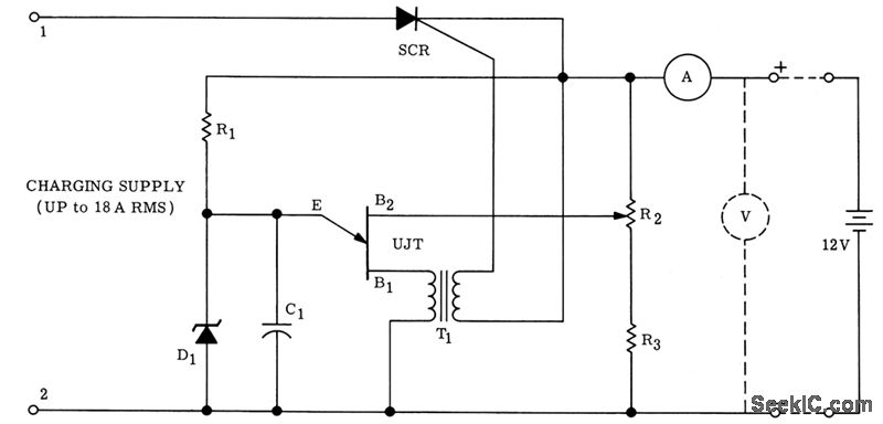 Ujt with R1, R2, R3, and C1 form relaxation oscillator that gets power from battery being charged andserves to trigger scr through T1. When required firing voltage of unijunction, as determined by battery voltage, exceeds break down of zener D1, ujt can no longer oscillate, and charging ceases. R2 controls cutoff point. Charger is protected because scr cannot conduct under conditions of short-circuit, open circuit, or reverse polarity connection to battery. Values are: R13.9K; R2-2.5K; R3-3.3K; C1-0.25 mfd; D1-lN753 zener 6.2 v, 400 mw; SCR-MCR 808-3; UJT-2N2160.-R.Wechsler, A Unique Battery Charger Control Circuit, Motorola Application Note AN-179, Feb. 1966.