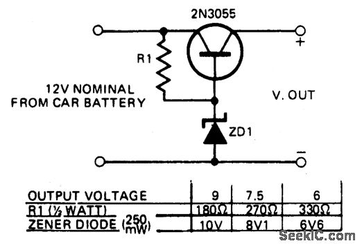 This circuit enables transistorized items such as radio, cassettes, and other electrical devices to be operated from a car's electrical supply. The table gives values for resistors and specified diode types for different voltage. Should more than one voltage be required a switching arrangement could be incorporated.For high currents, the transistor should be mounted on a heatsink.