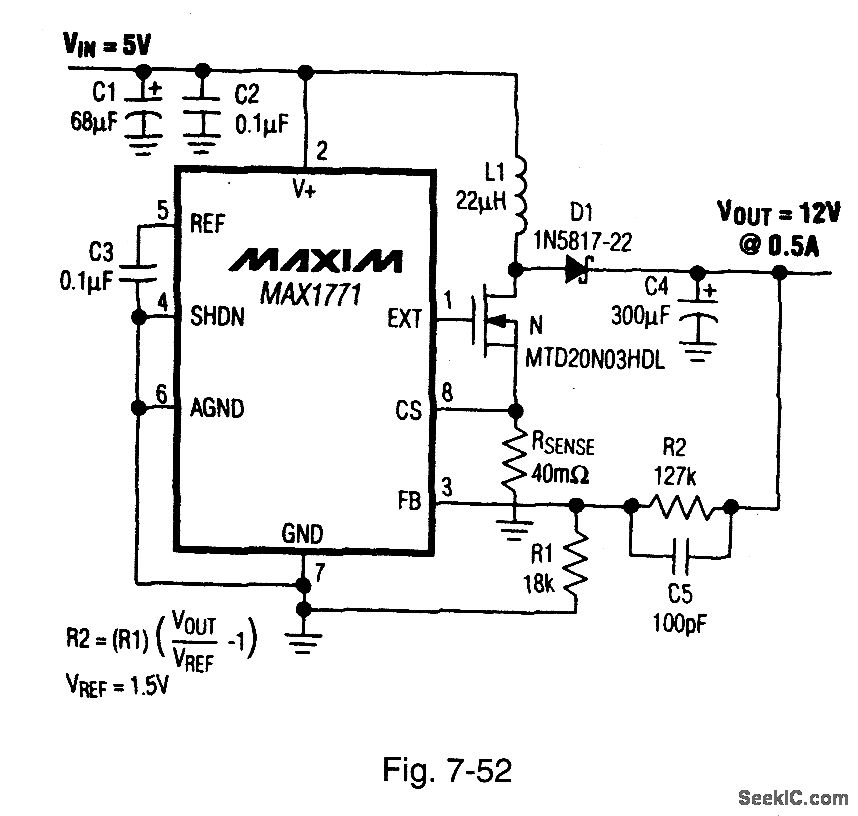 Figure 7-52 shows the MAX1771 connected to provide 12-V output at 0.5 A, with a 5-V input. See Fig. 7-51 for component suppliers. This non-boot-strapped version of the Fig. 7-50 controller requires less supply current, but with the full 5-V input. Use the Fig. 7-50 controller for input less than 5 V. Maxnvt NEW RELEASES DATA BOOK, 1995, P. 4-20.