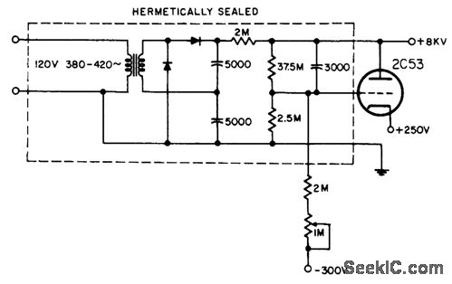 Used to power special-purpose dark-trace tube. Triode in parallel with output provides voltage regulation to overcome effects of changing line voltage, improve output ripple, and improve output impedance characteristics.-NBS, Handbook Preferred Circuits Navy Aeronautical Electronic Equipment, Vol. 1, Electron Tube Circuits, 1963, p N14-1.